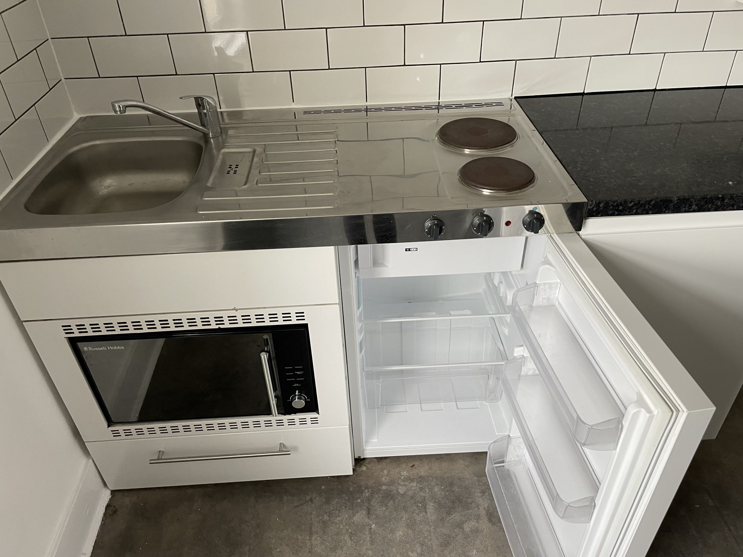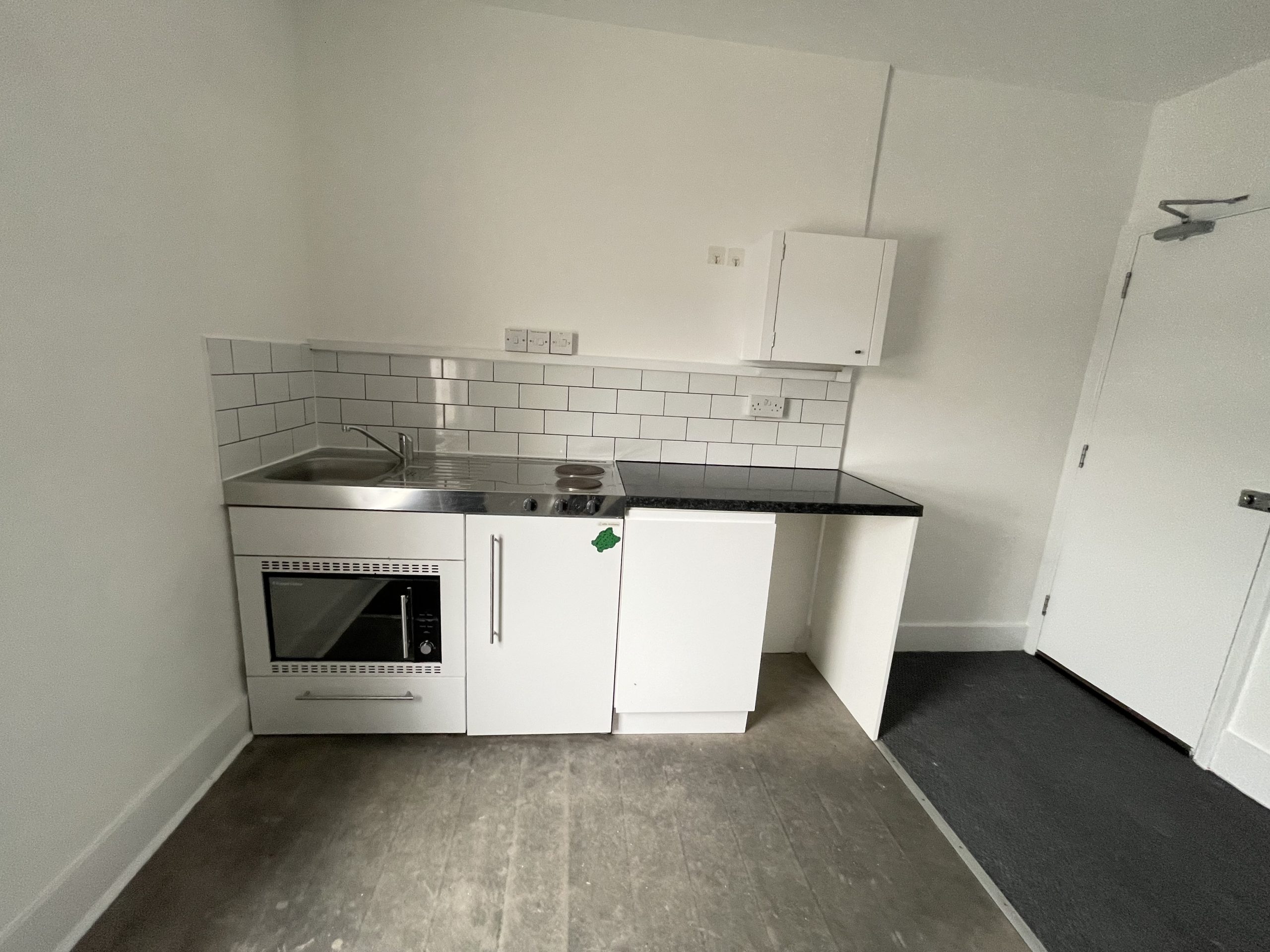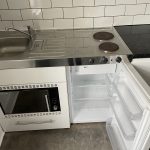 - Kitchen with hob, built in microwave oven and fridge