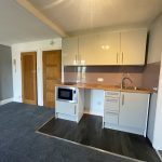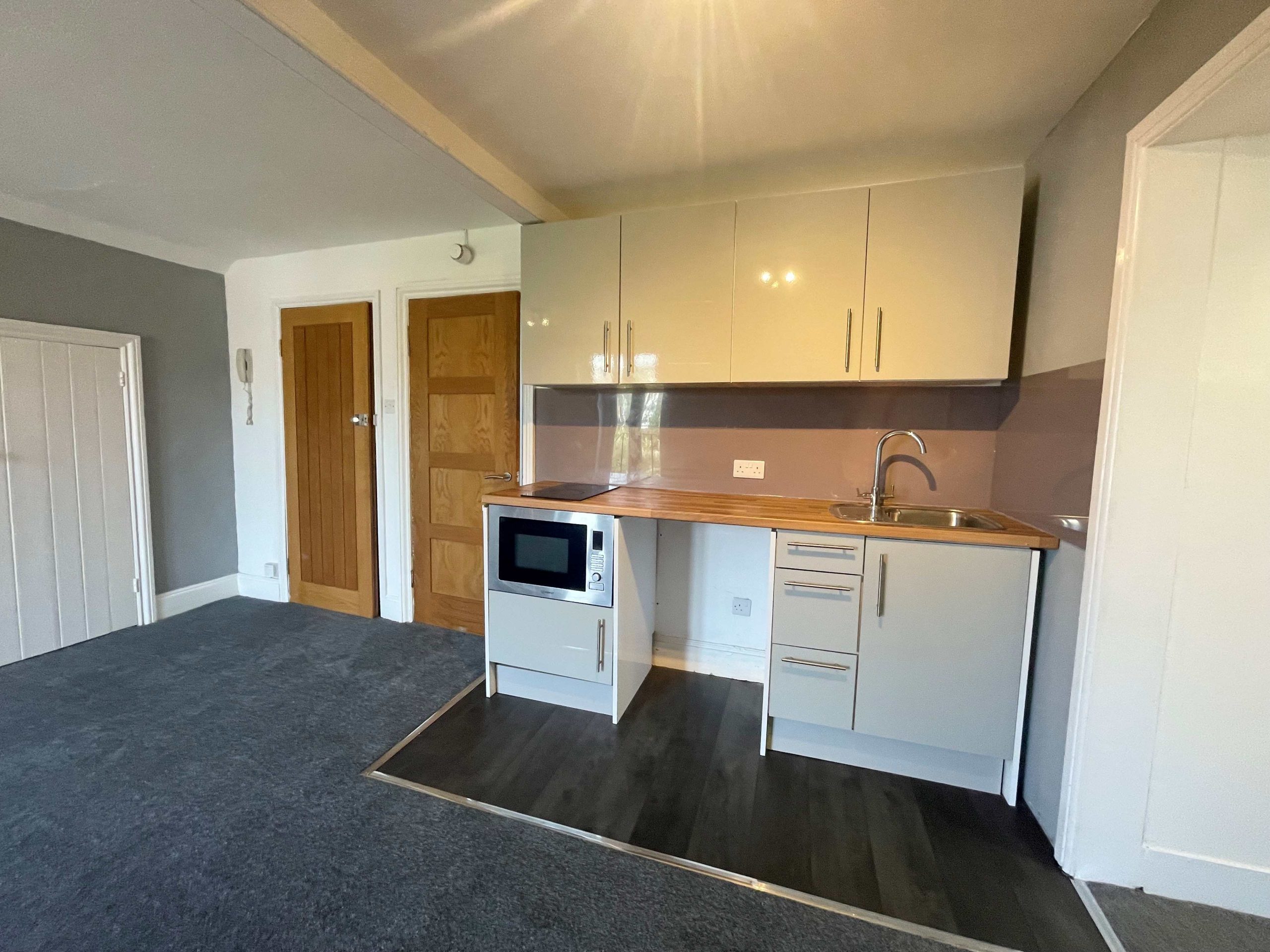 A range of wall and base units, modern contoured work surface. Built in mircowave oven and electric hob. Stainless sink and drainer with mixer tap. Splash back. Space and point for under counter fridge.