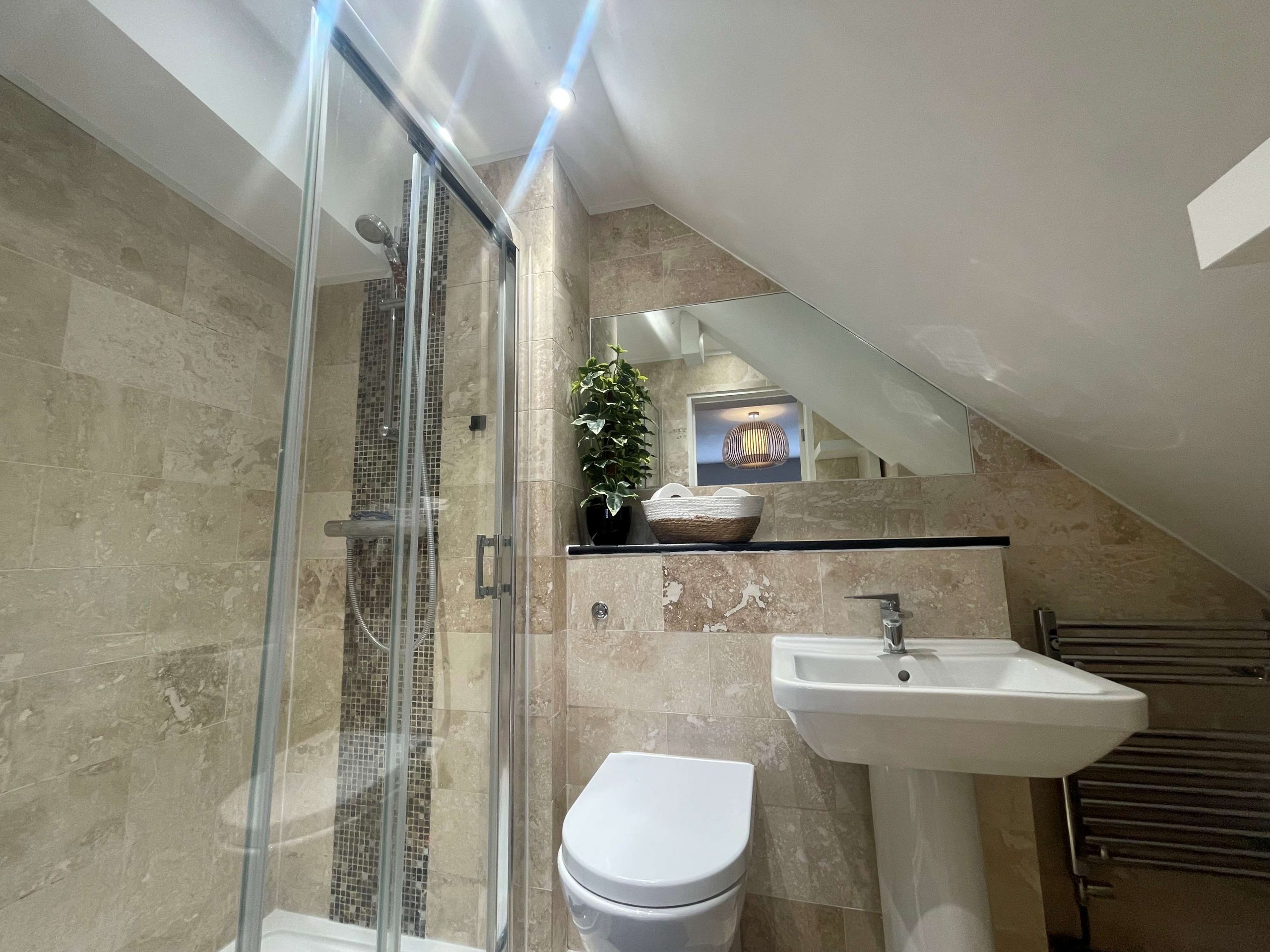En-Suite Shower Room - Luxury refitted white suite comprising of low-level flush WC with concealed cistern. Vanity unit with inset wash hand basin and chrome mixer tap and drawers below. Shower cubicle with wall mounted shower. Attractive tiled walls and floor. Extractor fan. Recessed ceiling spotlights. Heated towel rail.