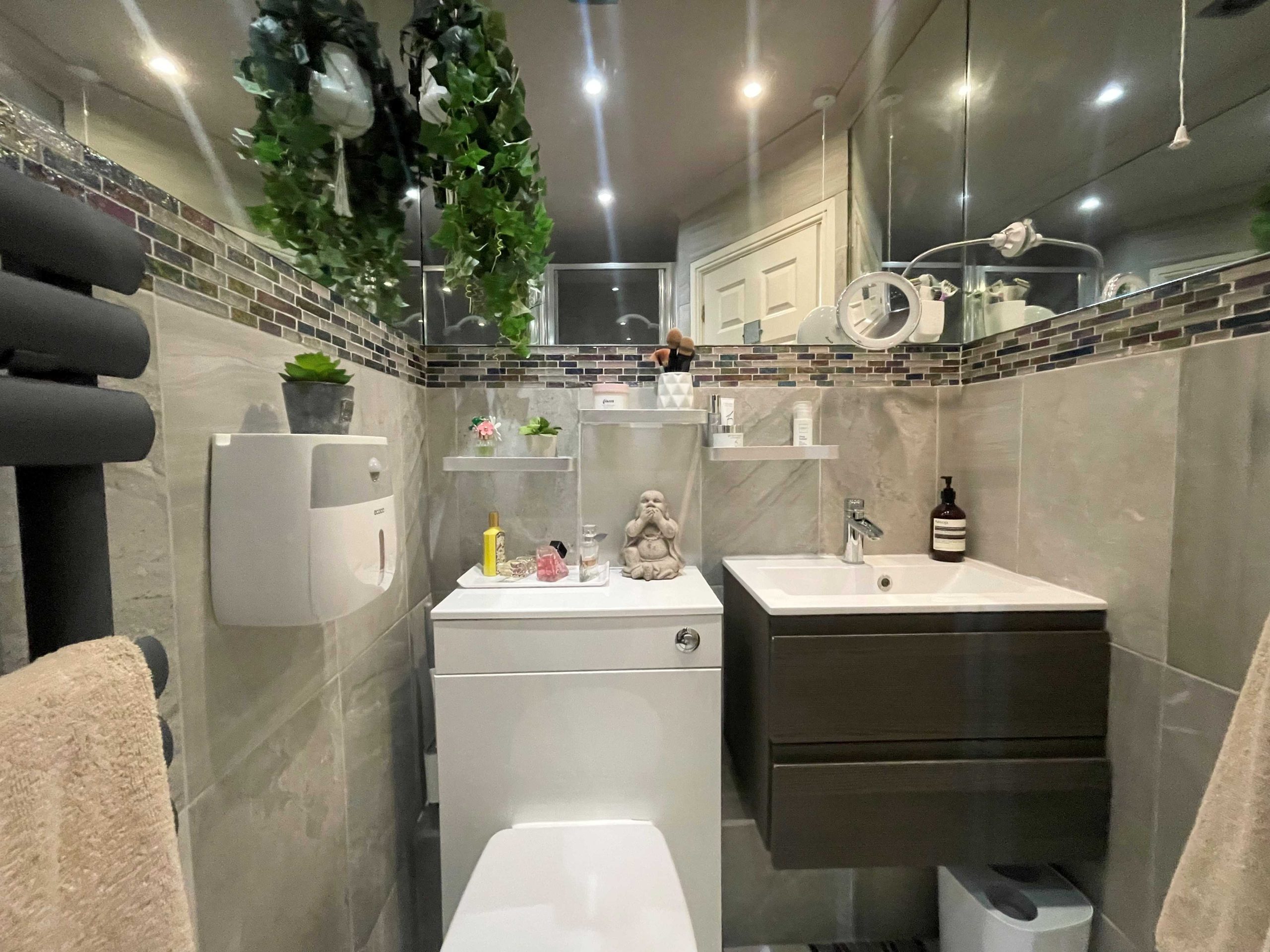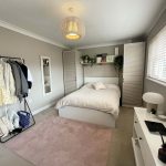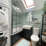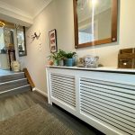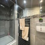 Family Bathroom – Modern refitted white suite comprising of panelled bath with rainwater shower head over. Low level flush WC. Wash hand basin set in vanity unit with built in cupboards and chrome mixer tap. Heated towel rail. Skylight. Space and plumbing for washing machine and tumble dryer.